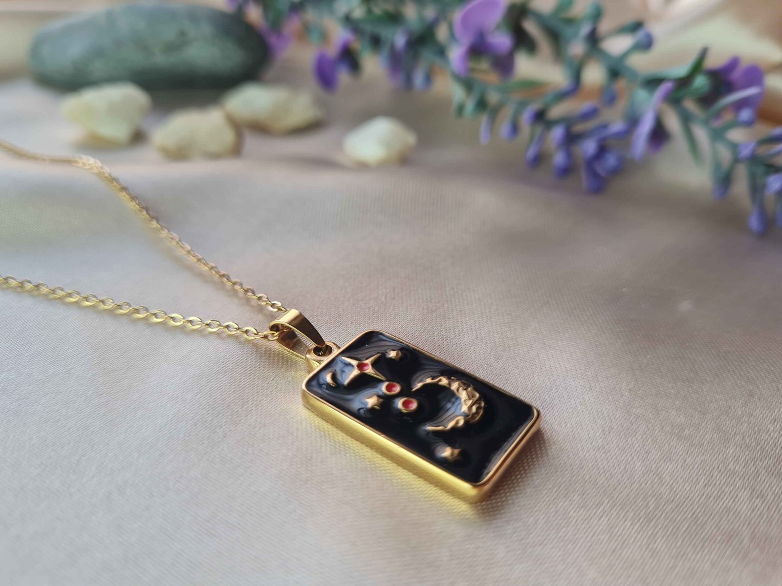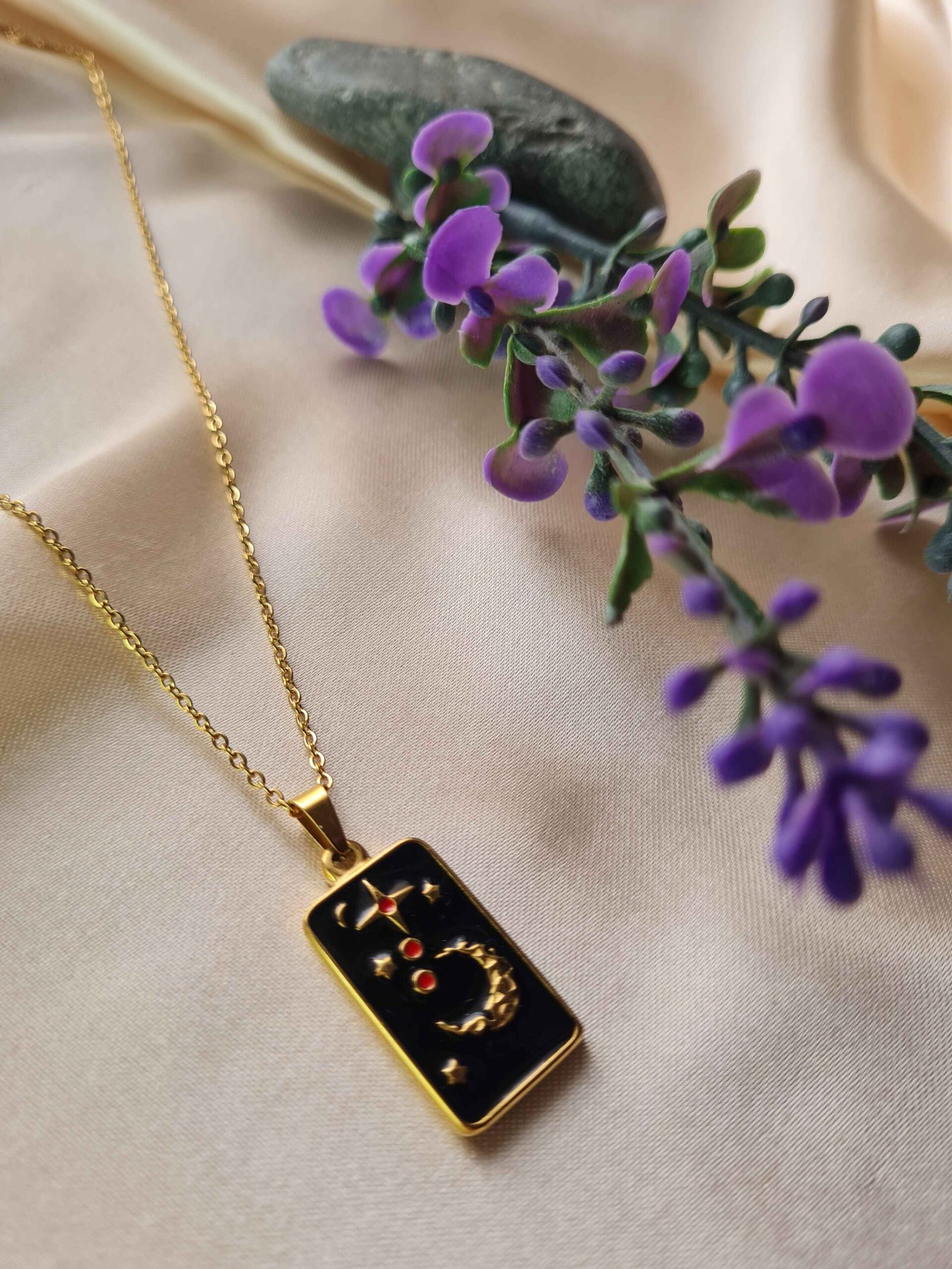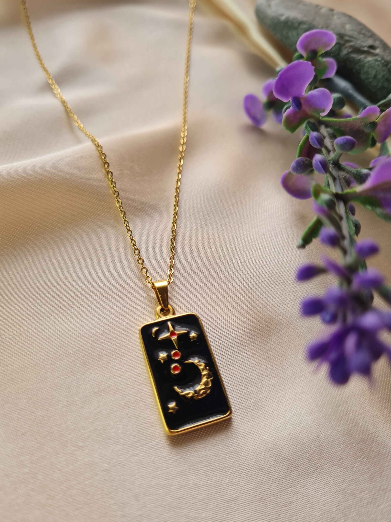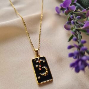 Capture the magic of the night sky with this elegant rectangular pendant. Featuring a golden crescent moon, sparkling stars, and subtle red accents set against a deep black enamel background, this necklace adds a celestial touch to any outfit. Perfect for layering or wearing solo.